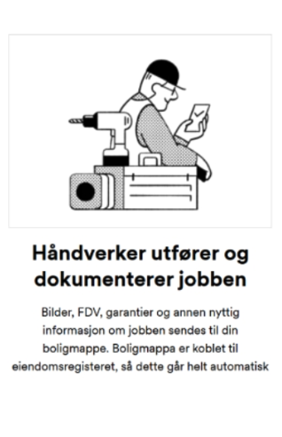 Boligmappa hjelper deg holde styr på boligen – og alle papirene. Håndverkere registrerer utført arbeid, helt automatisk. Selv kan du laste opp kvitteringer, fargekoder og annet nyttig.